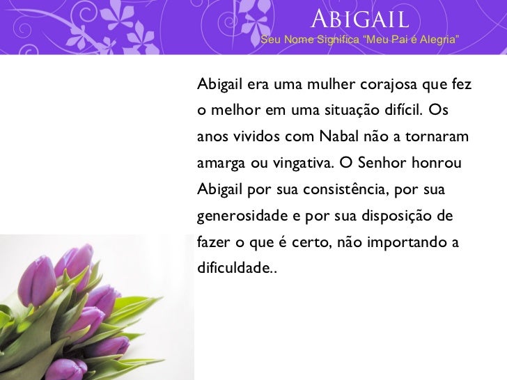 O nome Abigail significa motivo de alegria. Un nombre con mucha historia lleno de misterios de pasión y que tuvo mucha presencia en el mundo Cristiano. LA ALEGRIA DE MI PADRE EL GOZO DE MI PADRESu esp. 25 Samuel murió y fue enterrado en Ramá donde había vivido. Así pues el difícil matrimonio de Abigail llegó a su fin gracias al merecido castigo que Dios le impuso a Nabal. Logo após a morte de Nabal Davi agradeceu a Deus por ter-lhe livrado de cometer um grave erro diante do Senhor. Este útimo tenía unas diferencias de carácter muy grandes respecto a.